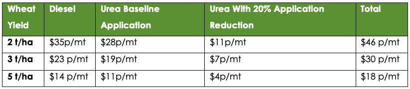 Nitrogen fertiliser is typically the largest single input in wheat production. For this analysis, consider a representative program of 140 kg/ha urea applied for nitrogen.